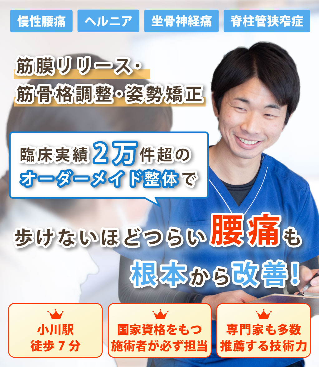 慢性的な腰痛、椎間板ヘルニア、ぎっくり腰、坐骨神経痛など腰痛の経験施術が豊富な整体院です。施術して終わりではなく、その後の自宅でできるセルフストレッチや生活習慣の指導もいたします。